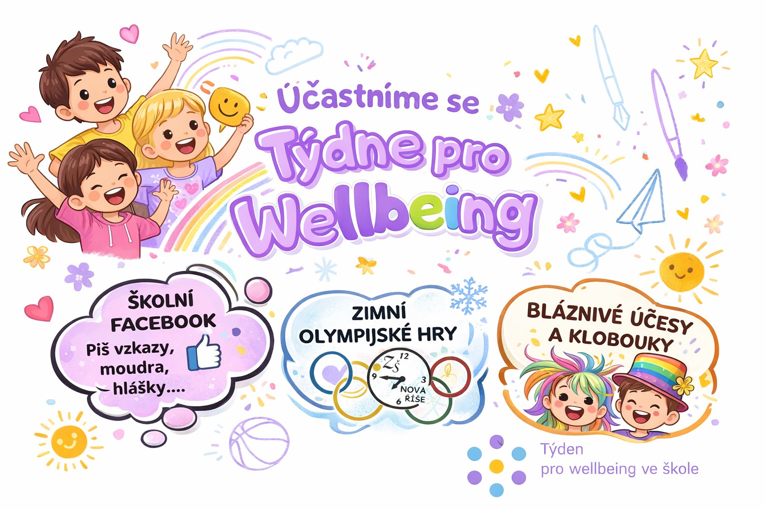 V týdnu od 4. – 11. února 2026 se naše škola zapojila do celorepublikové soutěže Tyden pro wellbeing ve škole. Cílem akce je podpořit dobrou náladu a pohodu ve škole. Této akce jsme se účastnili letos druhým rokem a opět se její organizace ujaly kolegyně Markéta Veselá s Hanou Peškovou. Jaké akce se uskutečnily ve škole v jednotlivých dnech, jsme psali v předchozím článku. Nyní bychom Vám chtěli ukázat, co se ve škole skutečně dělo. 😊